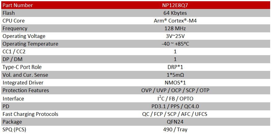 The NP12 is a highly integrated fast-charging protocol IC supporting USB Type-C PD or single-port Type-A applications, featuring a built-in high-performance processor and large-capacity programmable Flash memory. It integrates CC/CV control loops, bidirectional discharge circuitry, and multiple system protection functions. With its highly integrated design requiring minimal external components, it provides a complete, low-cost solution for applications such as power adapters and car chargers.